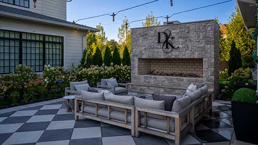 The outdoor rooms unfold with intention, anchored by a dramatic linear fire feature and supported by a full-size sport court for basketball and pickleball. All around, a lush, layered planting design adds movement, texture, and year-round interest, while screening the space for privacy. The features included in this landscape design ensure a tranquil escape for this exclusive residence.